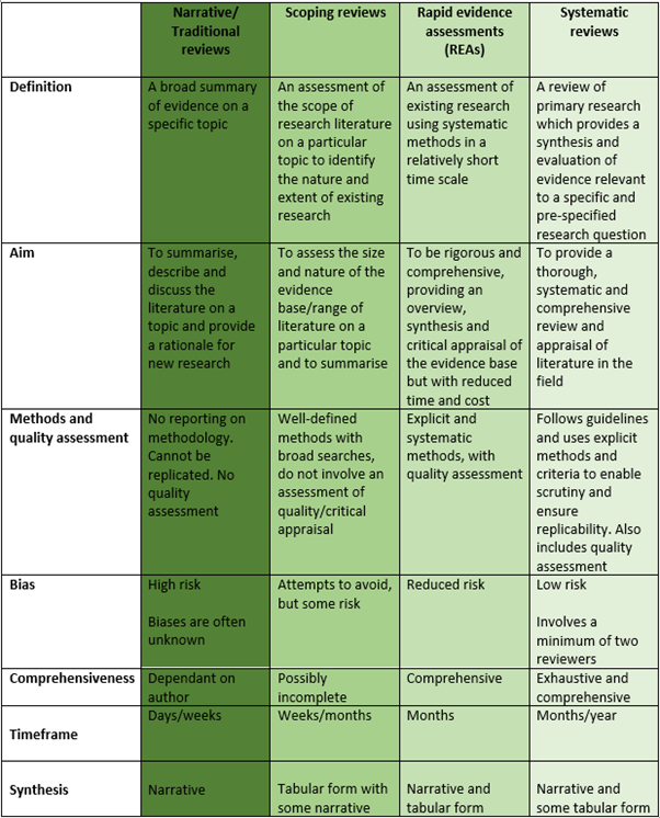 Whilst variation exists in relation to definitions and features of the different forms of review, the table below collates some of the most commonly-cited key details, features and characteristics of different types of reviews to underline the main differences between them.