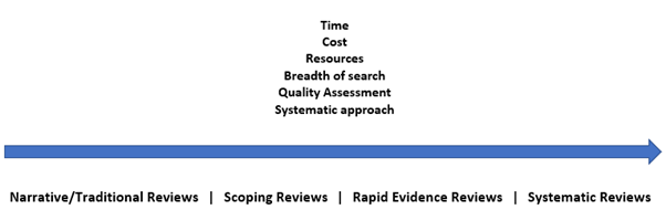 White background with black text: “time, cost, resources, breadth of search, quality assessment, systematic approach” above a long blue arrow.